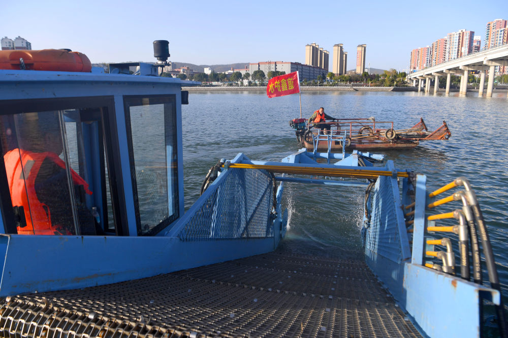 2024年10月28日,丹江口市清漂队队员在库区进行清漂作业。