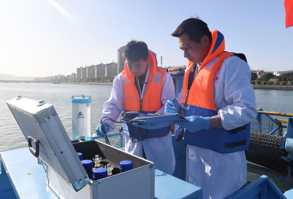 2024年11月28日,在淅川县鹳河流域城区段,南阳市生态环境局淅川分局工作人员记录采样水质情况。