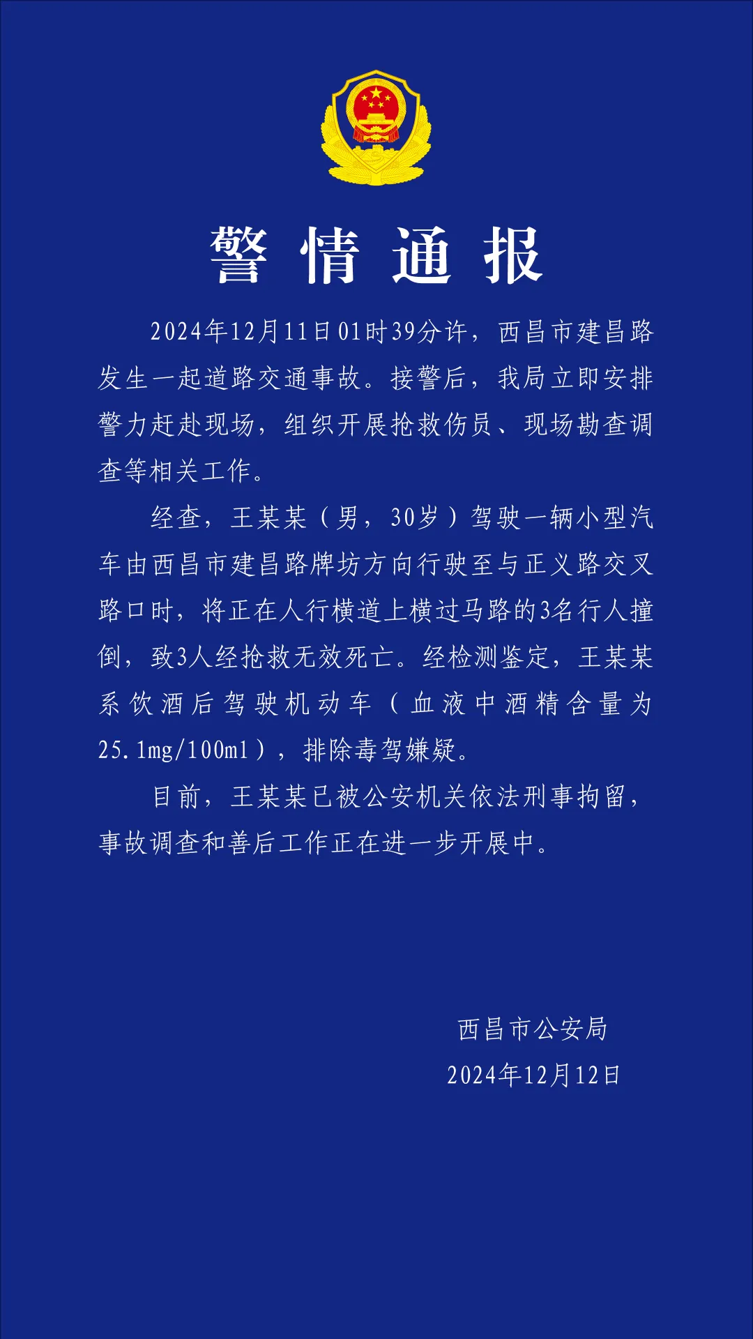 四川西昌公安:一男子驾车撞倒3名行人,致3人死亡,该男子系酒后驾车,已被刑拘