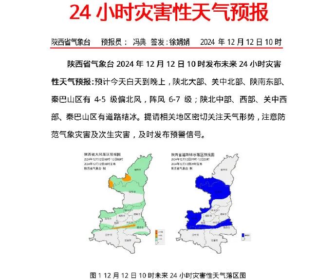陕西省气象台2024年12月12日10时发布未来24小时灾害性天气预报:预计今天白天到晚上,陕北大部、关中北部、陕南东部、秦巴山区有 4-5 级偏北风,阵风 6-7 级;陕北中部、西部、关中西部、秦巴山区有道路结冰。提请相关地区密切关注天气形势,注意防范气象灾害及次生灾害,及时发布预警信号。