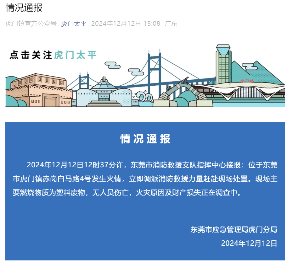 2024年12月12日12时37分许,东莞市消防救援支队指挥中心接报:位于东莞市虎门镇赤岗白马路4号发生火情,立即调派消防救援力量赶赴现场处置。现场主要燃烧物质为塑料废物,无人员伤亡,火灾原因及财产损失正在调查中。