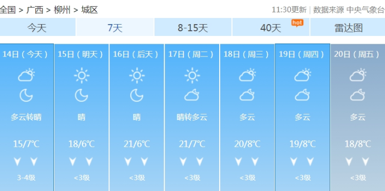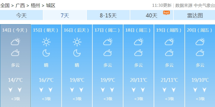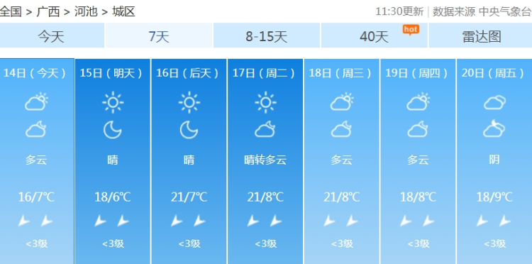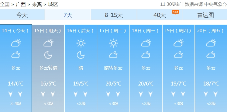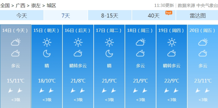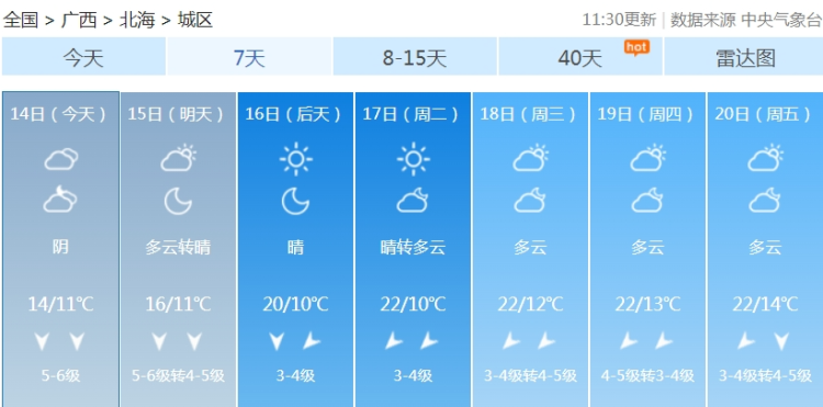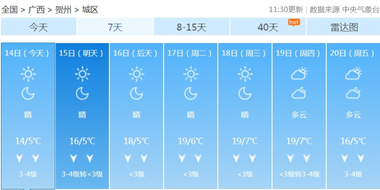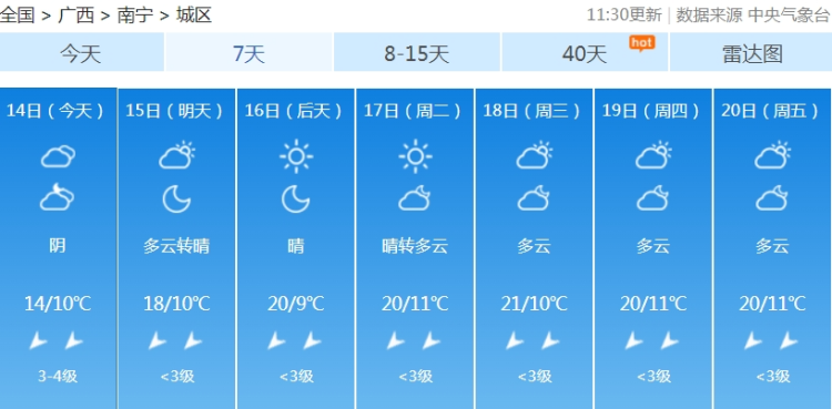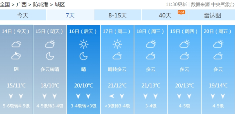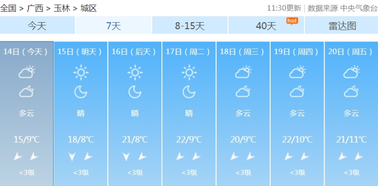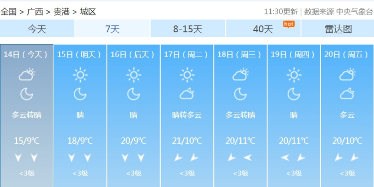 14日晚上到15日白天,全区多云到晴。沿海地区有5~6级、阵风7~8级偏北风。高寒山区部分地区有霜冻或冰冻。最低气温:高寒山区-6℃~2℃,桂北2℃~6℃,桂南6℃~11℃。