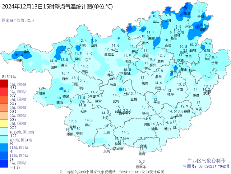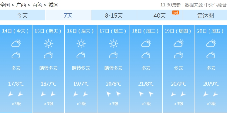 15日晚上到17日白天,全区晴间多云。高寒山区和桂东北部分地区有霜冻或冰冻。最低气温:高寒山区-6℃~2℃,桂北2℃~6℃,桂南6℃~11℃。