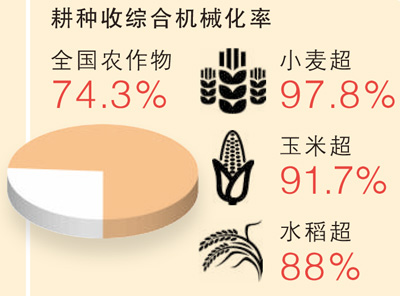 我国是世界第一农机生产和使用国。2023年,农作物生产机械化作业面积超75.7亿亩次。高端智能拖拉机、北斗辅助驾驶系统等高性能农机(具)广泛应用;丘陵山区玉米播种机、轨道运输机等实现“有好机用”;设施巡检机器人等智能农机装备打破国外垄断。