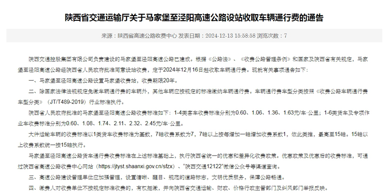 12月13日,陕西省交通运输厅发布通告,陕西交通控股集团有限公司负责建设的马家堡至泾阳高速公路已建成。根据《公路法》《收费公路管理条例》和国家及陕西省有关规定,马家堡至泾阳高速公路经陕西省人民政府批准同意设站收费,定于2024年12月16日起收取车辆通行费。