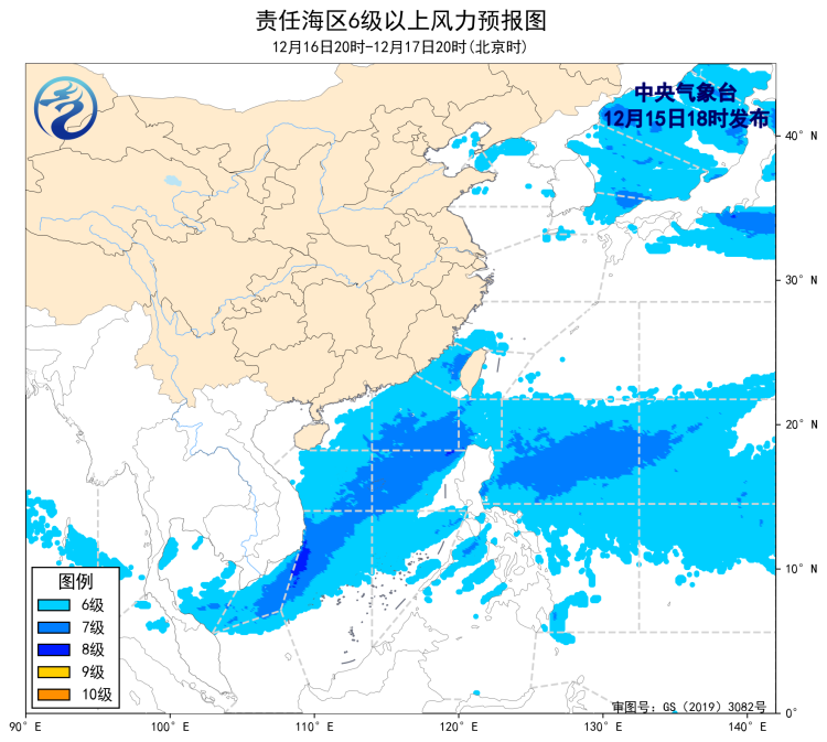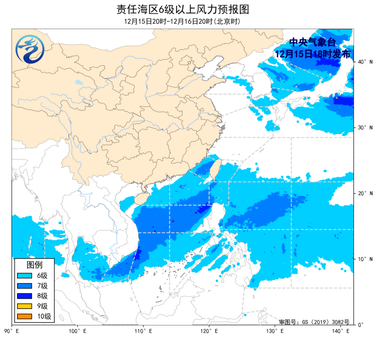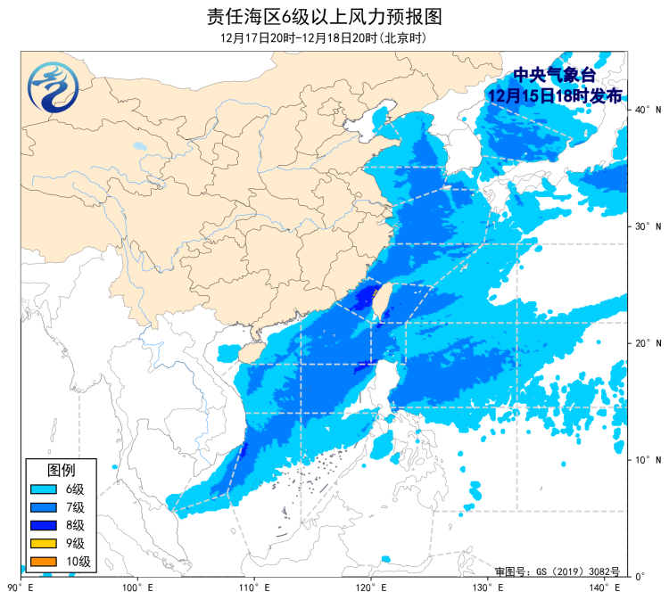 预计,18日夜间至19日夜间,黄海大部海域、东海大部海域、台湾海峡、台湾以东洋面、巴士海峡、南海大部海域、北部湾将有6~8级、阵风9级的偏北到东北风,其中台湾海峡和巴士海峡部分海域风力可达9级、阵风10级;20日白天至22日白天,渤海、渤海海峡、黄海大部海域、东海大部海域、台湾海峡、台湾以东洋面、南海大部海域、北部湾将先后有6~8级、阵风9级的偏北到东北风,其中台湾海峡、巴士海峡、南海东北部的部分海域风力可达8~9级、阵风10级。