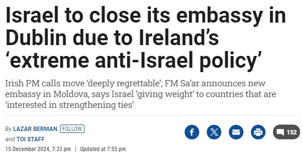 △以色列时报15日报道,以色列准备关闭驻爱尔兰大使馆