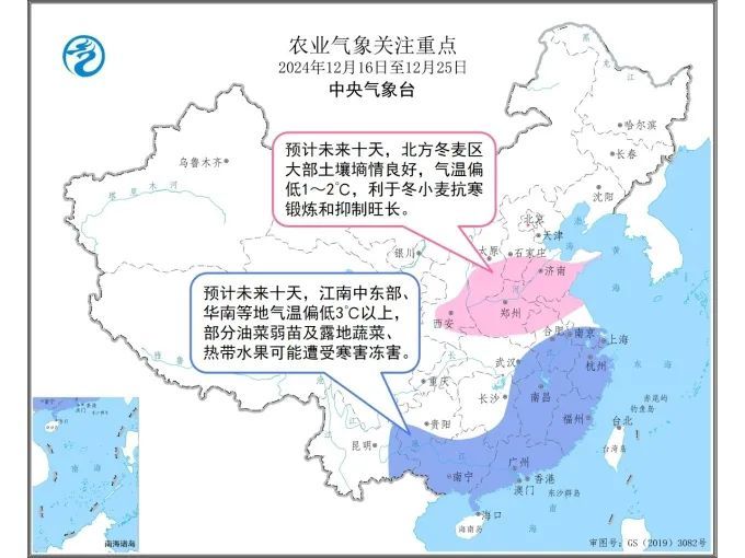预计未来10天,新疆、西北地区东部和北部、华北西部、黄淮以南大部地区气温较常年同期偏低1至3℃,其中南疆盆地、江南中东部、华南等地部分地区偏低4℃以上。16日前后,新疆北部部分地区有小到中雪、局地有大到暴雪;18至19日,西南地区东部、湖北西部有小雨或雨夹雪,西北地区东部有小雪;19至21日,受冷空气影响,中东部大部地区气温下降4至6℃,淮河以北地区有4至6级偏北风。大风降温雨雪天气不利于上述地区设施农业和畜牧业生产,增加防寒保暖和管理成本。北方冬麦区大部土壤墒情良好,气温偏低利于冬小麦抗寒锻炼和抑制麦苗旺长;冷空气过后华北、黄淮冬小麦将陆续开始进入越冬期。南方大部农区气温偏低,长江中下游、华南、西南地区东南部等地部分油菜弱苗及露地蔬菜、热带水果等可能遭受寒害冻害;四川盆地、贵州、云南中南部等地累计降水量有5至20毫米,利于库塘蓄水和土壤增墒,但低温阴雨天气可能影响设施农业和经济林果品质提升以及成熟果蔬采摘上市。