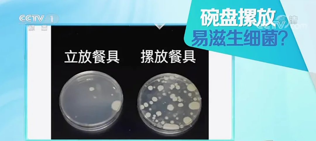 三天后对比显示,立着餐具的菌落总数为8000cfu/套,符合我国相关卫生标准;而摞着放的细菌数量是560000cfu/套,为立着放的70倍。