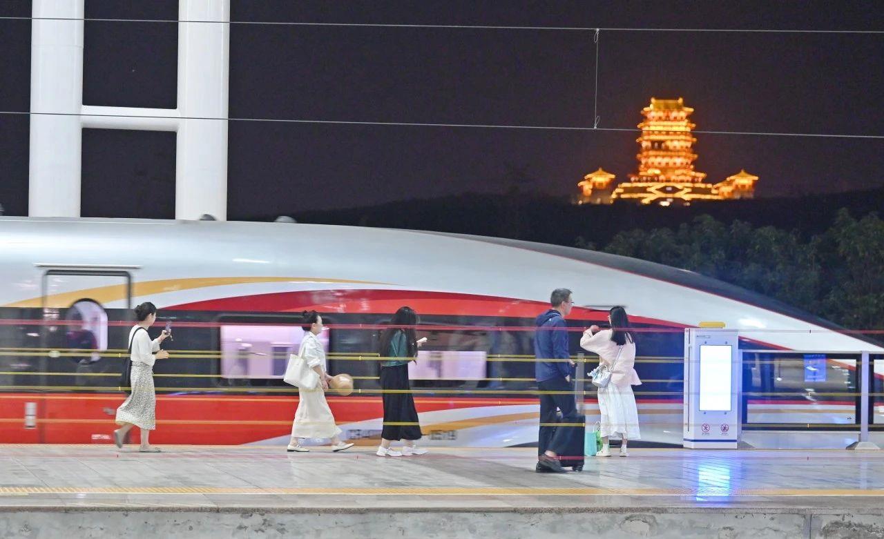 洛阳龙门站位于古都洛阳,我国四大石窟之一的龙门石窟就在此地。旅客在站台上能够与复兴号和牡丹阁同框拍照。