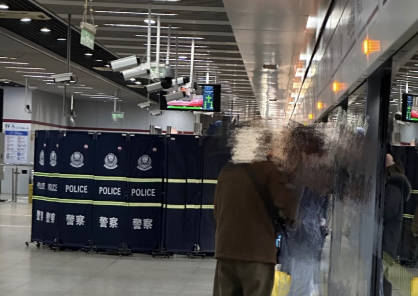 爆料网友表示,自己在地铁站上扶梯的时候,看到下面有副担架,上去后就看到这一幕:有个人躺在地上,旁边还有警察设置的遮挡板进行围挡。