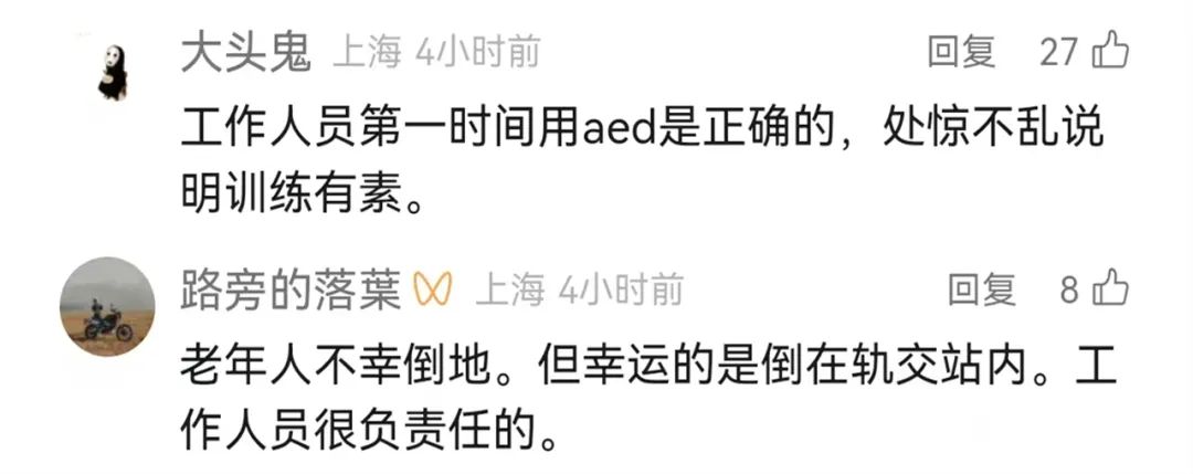 据悉,16日早晨,地铁11号线嘉定北站的站台上突然有一名五旬男乘客晕倒。地铁工作人员发现该男子呼吸微弱、瞳孔扩散,失去意识,民警立即将四周围挡起来,工作人员在胸外按压无效后,立即启用了AED装置(自动体外除颤仪)并拨打120。