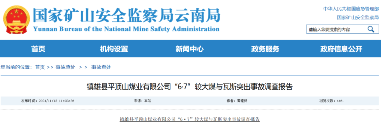 日前,国家矿山安全监察局云南局公布了《镇雄县平顶山煤业有限公司“6·7”较大煤与瓦斯突出事故调查报告》。经调查认定,这是一起煤矿违章指挥,在煤层未消除突出危险的情况下冒险作业,相关煤矿安全监管部门未认真履行职责,地方党委政府督促不力,致使重大安全风险管控不力而导致的一起生产安全责任事故。