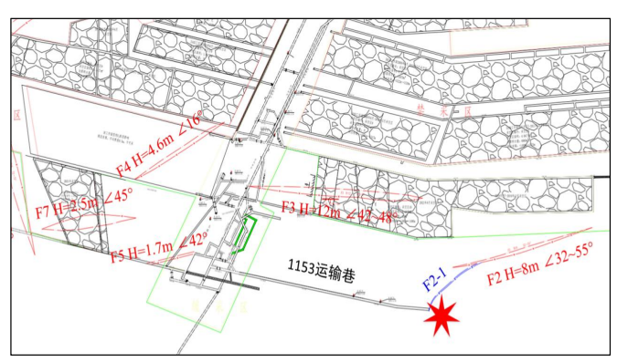 1.煤矿1153运输巷掘进工作面突出点位于向斜轴部的断层尖灭区,地应力大、瓦斯压力大、煤质变软,具备煤与瓦斯突出危险。