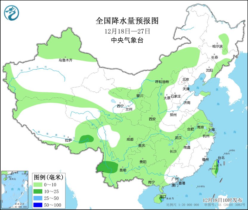 未来10天(12月18-27日),新疆北部、四川东部、贵州、云南、海南岛、台湾岛等地累计降水量有5~10毫米,其中云南西南部、海南岛东部、台湾岛东部部分地区有15~20毫米,台湾岛东北部局地有40~70毫米。全国大部地区降水稀少。
