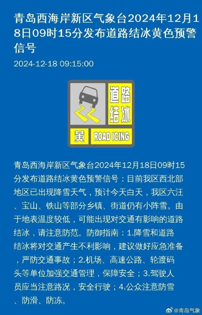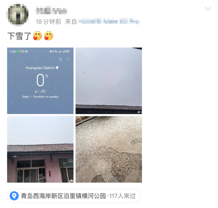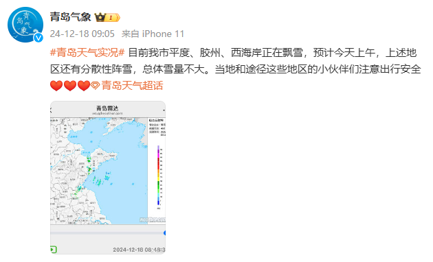 据@青岛气象 发布的天气实况,目前我市平度、胶州、西海岸新区正在飘雪,预计今天上午,上述地区还有分散性阵雪,总体雪量不大。当地和途经这些地区的小伙伴们注意出行安全。