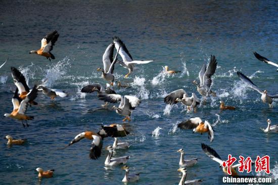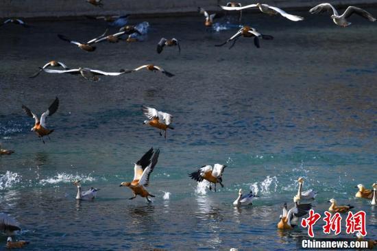 斑头雁、赤麻鸭等候鸟在拉萨河里觅食、嬉戏。