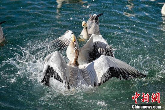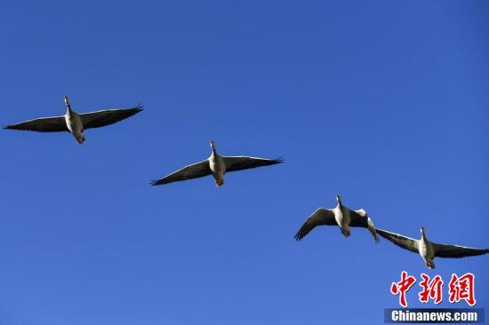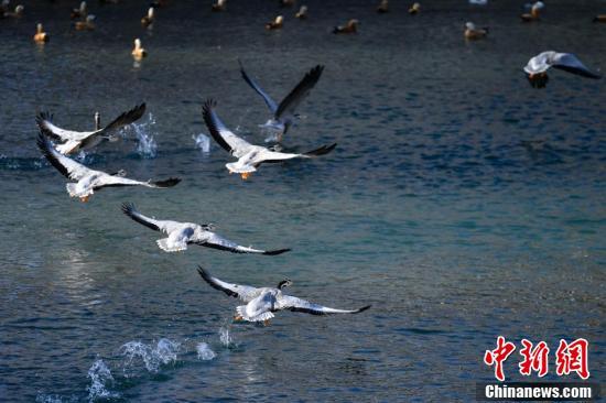 12月17日,入冬以来,大批候鸟飞抵拉萨栖息越冬。拉萨河、宗角禄康公园等地,成为它们的天堂。在拉萨河,赤麻鸭、斑头雁成群,时而觅食,时而嬉戏。宗角禄康公园的湖面上,候鸟闲游踱步,安然自在,展现出一幅和谐的生态画卷。图为12月17日,斑头雁、赤麻鸭等候鸟在拉萨河里觅食、嬉戏。