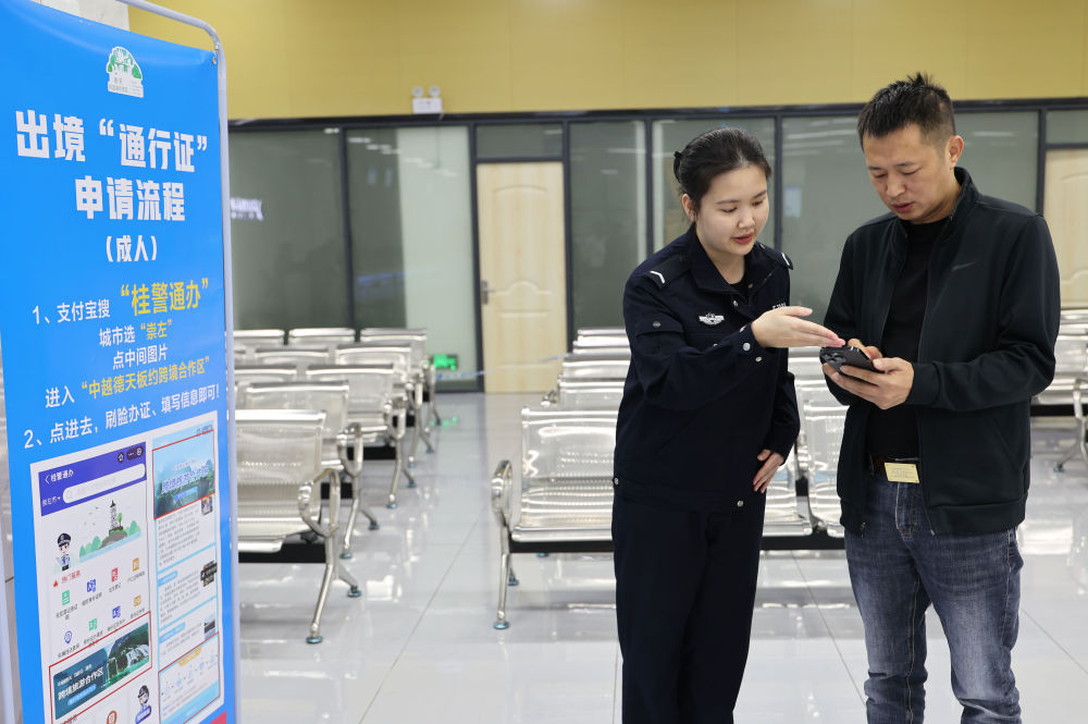 12月6日,在中越德天(板约)瀑布跨境旅游合作区出入境办证大厅,游客(右)线上申请跨境游出入境证件。