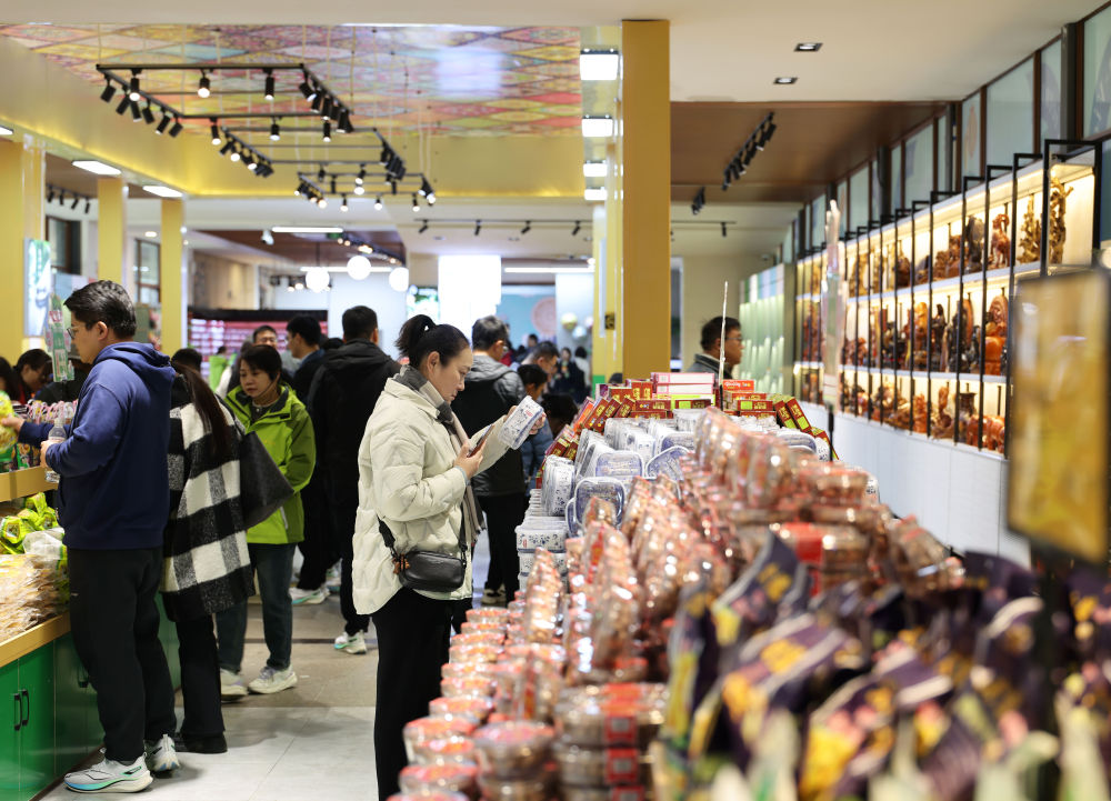 12月15日,在中越德天(板约)瀑布跨境旅游合作区中国一侧的中越旅游商品体验店,游客在选购商品。