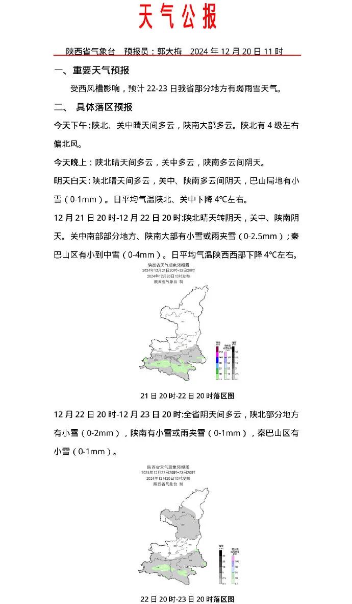 12月20日,陕西气象发布最新预报称,受西风槽影响,预计22-23日我省部分地方有弱雨雪天气。