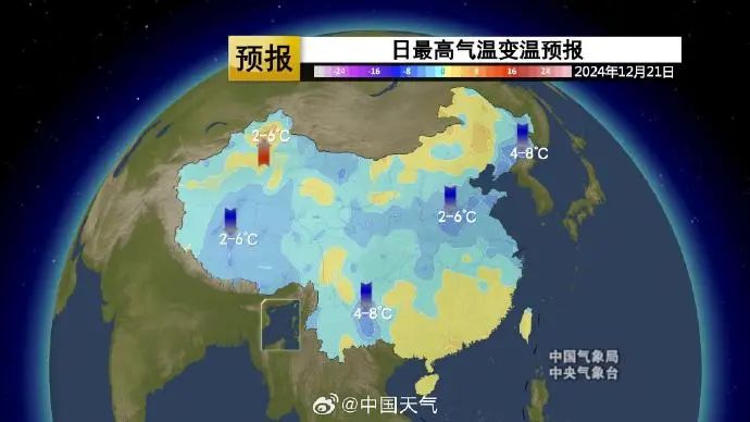 12月20日,据中国天气消息,今天,内蒙古到陕西北部等地的最高气温将下降4~8℃。明天冬至,冷空气继续向南推进,长江及其以北大部气温降温2~6℃。后天,长江及其以南大部出现2~6℃降温,南方也将逐渐转为偏低。