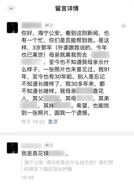 看到文章的当晚,许炳益就在下面留言,写下了一长串与母亲相关的信息供民警参考,希望民警也能帮他找到母亲的一张照片,圆他一个心愿。