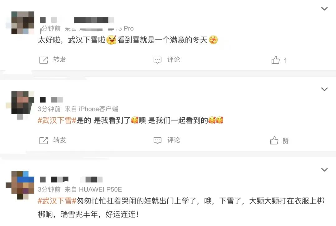 不少武汉网友也纷纷发文:“武汉下雪了!”“看到雪就是一个满意的冬天”“瑞雪兆丰年,好运连连!”