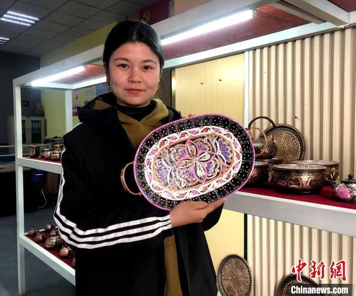中新网乌鲁木齐12月23日电 (陶拴科)冬日的清晨,在新疆和田地区洛浦县的传家宝手工艺品专业合作社里,“00后”女孩迪丽努尔·艾则孜和同事们正在精心制作一件件铜艺制品。