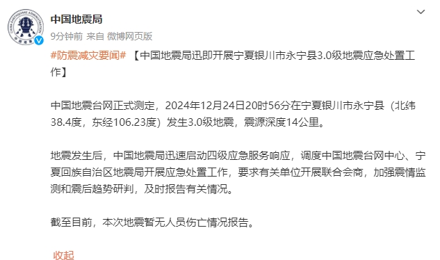 中国地震台网正式测定,2024年12月24日20时56分在宁夏银川市永宁县(北纬38.4度,东经106.23度)发生3.0级地震,震源深度14公里。