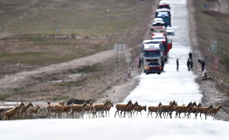 一群藏羚羊通过青藏公路前往青海三江源地区(2023年7月28日摄)。新华社记者 张宏祥 摄