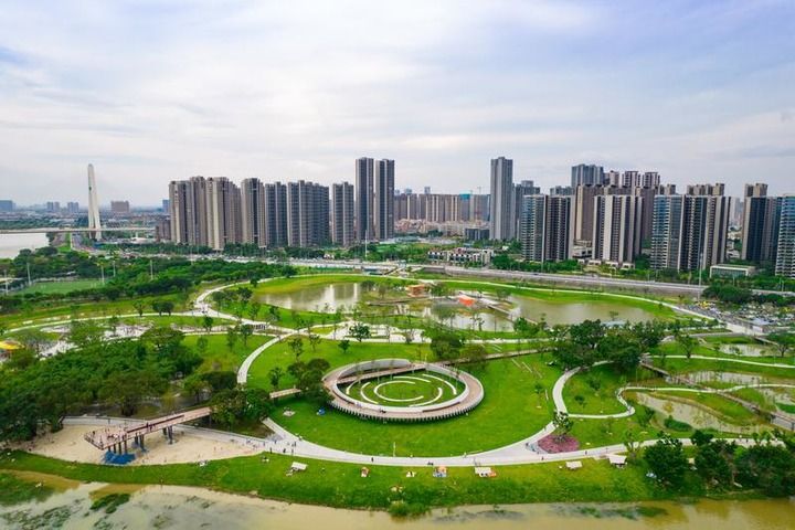 这是2022年6月5日在佛山市南海区丹灶镇拍摄的金沙岛国家湿地公园生态修复项目。该项目是南海区全域土地综合整治低效建设用地腾退并复垦复绿的示范项目之一。新华社发