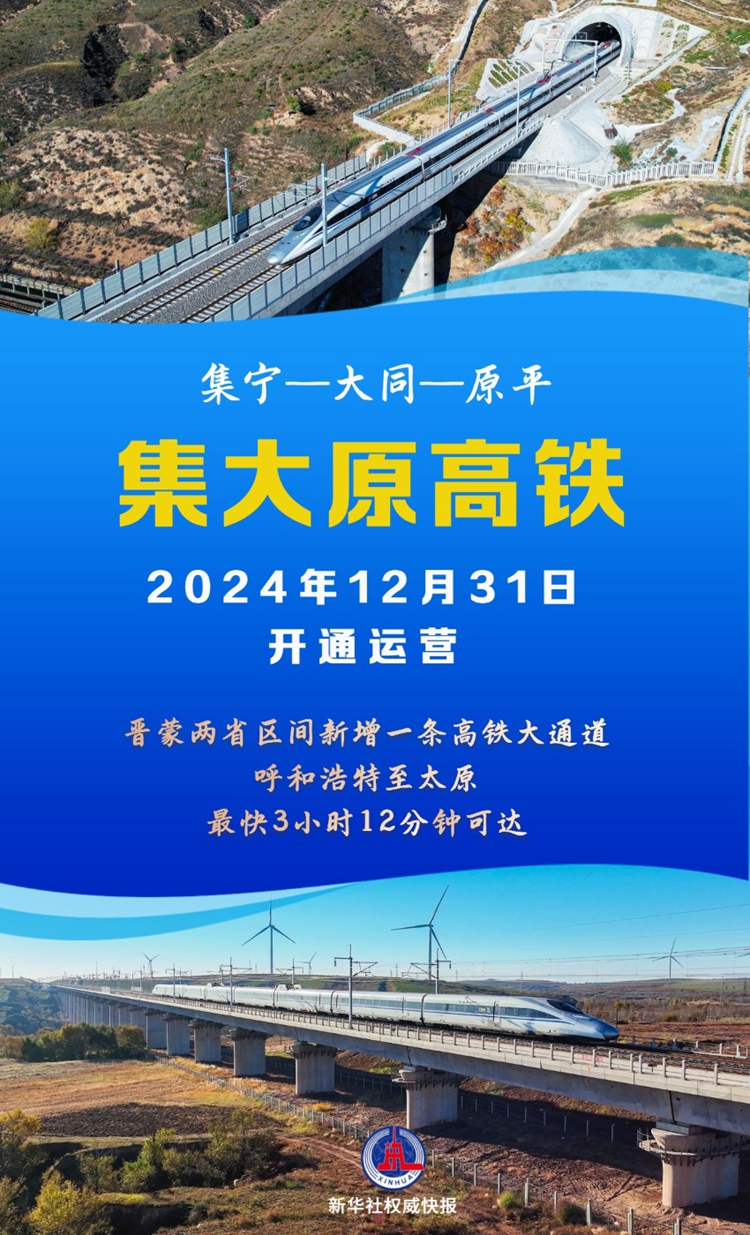 新华社呼和浩特12月31日电(记者朱文哲、许雄)连通内蒙古自治区和山西省的集宁经大同至原平高铁31日开通运营,乌兰察布至大同南站最快40分钟可达,呼和浩特东至太原南站最快3小时12分钟可达,晋蒙两省区间新增一条高铁大通道。