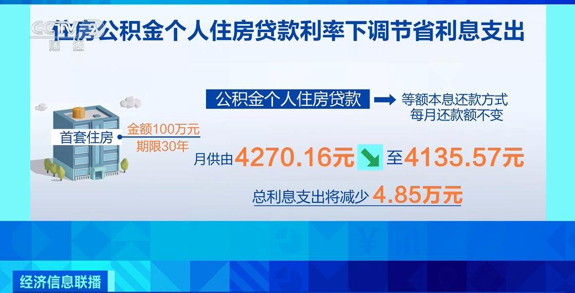 以一笔金额100万元、期限30年的首套住房公积金个人住房贷款为例,选择等额本息还款方式,也就是每月还款额不变的情况下,月供将由4270.16元降至4135.57元,总利息支出将减少4.85万元。