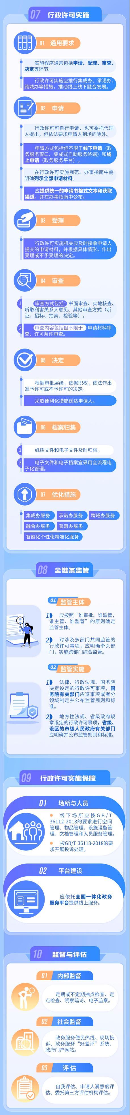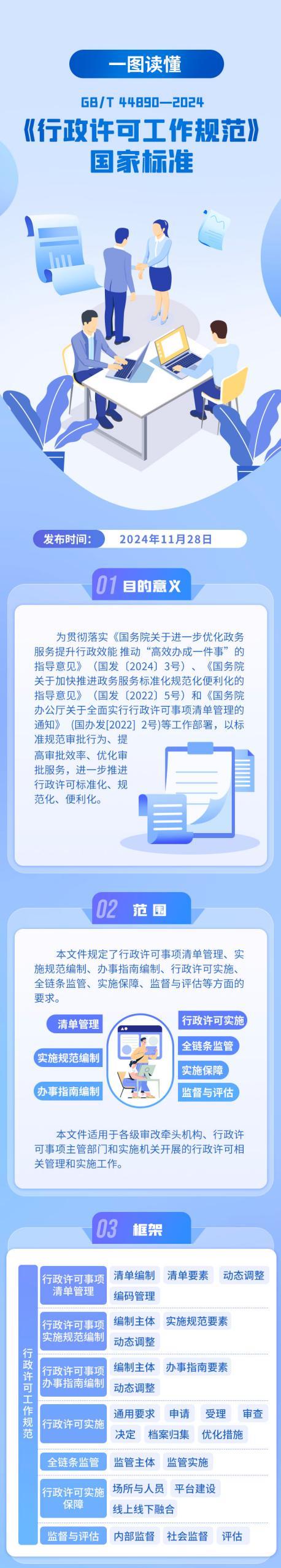 《行政许可工作规范》国家标准,规定了行政许可事项清单管理、实施规范编制、办事指南编制、行政许可实施、全链条监督、行政许可实施保障、监督与评估7方面要求