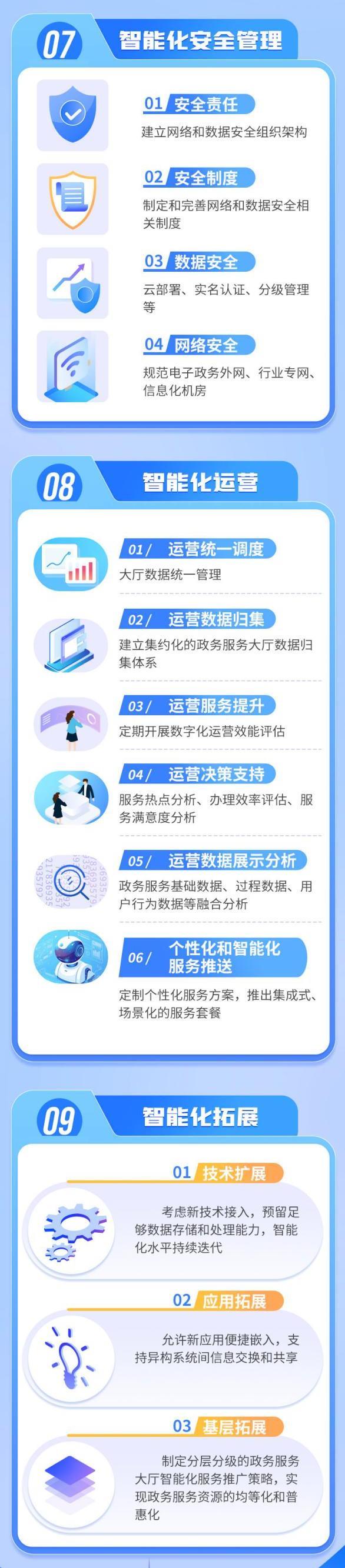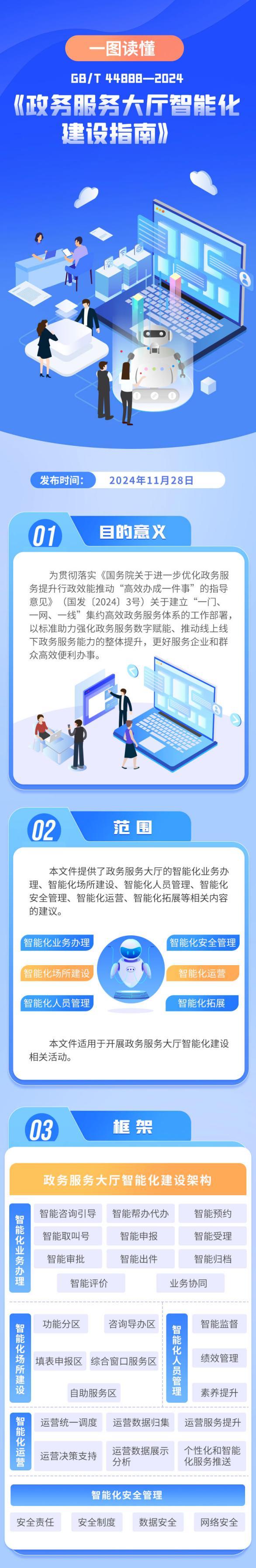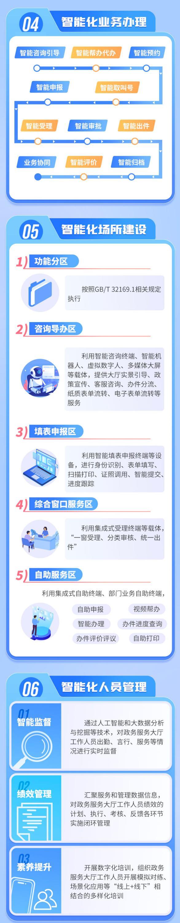 《政务服务大厅智能化建设指南》国家标准,提供了政务服务大厅的智能化业务办理、智能化场所建设、智能化人员管理、智能化安全管理、智能化运营、智能化拓展等方面的工作建议。