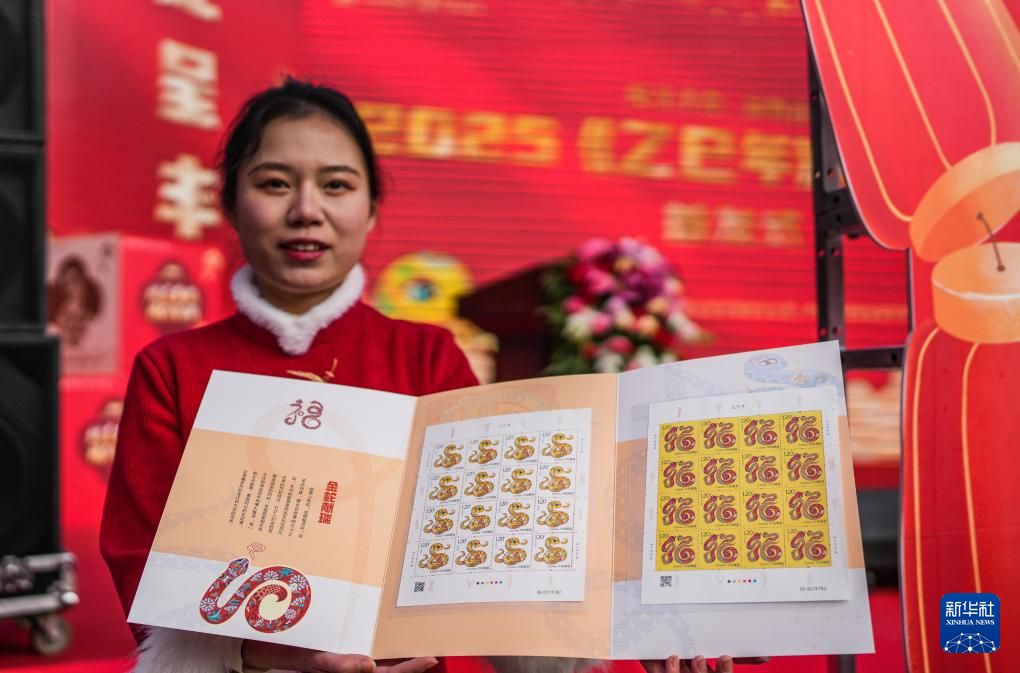 1月5日,工作人员在贵阳市黔灵山公园展示《乙巳年》特种邮票。
