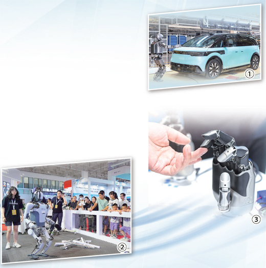 图①:在极氪智慧工厂第40万台汽车下线现场,工业版人形机器人正进行车标精准质检。