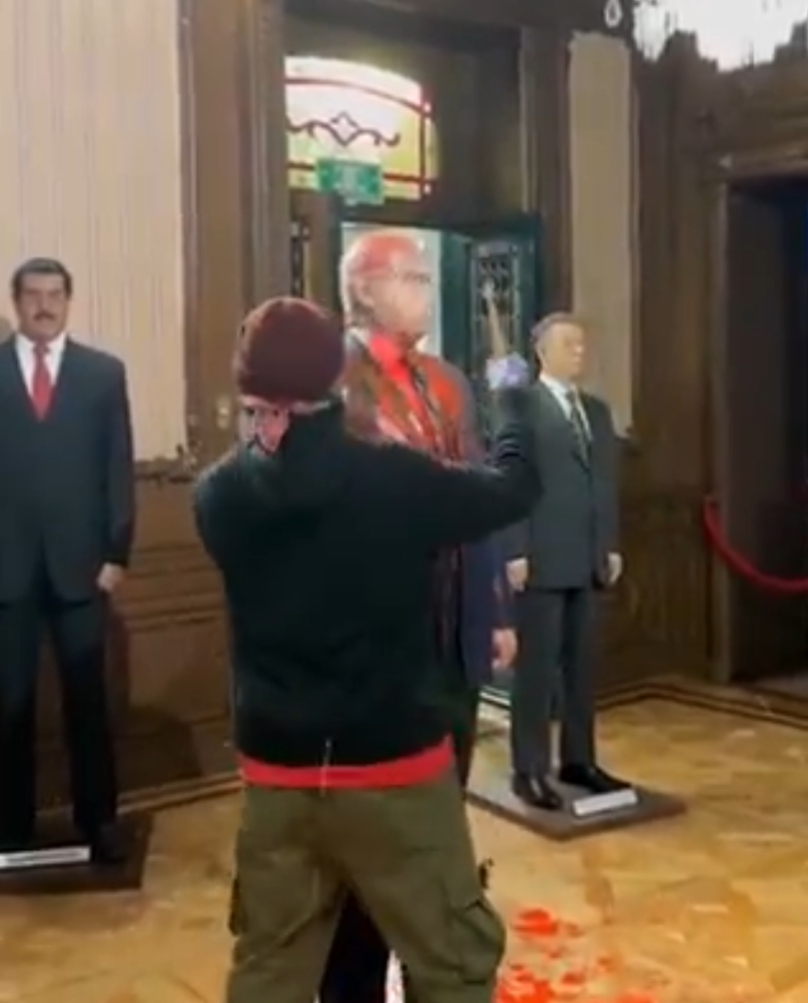 据报道,一个支持巴勒斯坦的账户在社交媒体上传了这名活动人士在该市蜡像馆破坏雕像的视频,视频标题为:“这是为了加沙。”