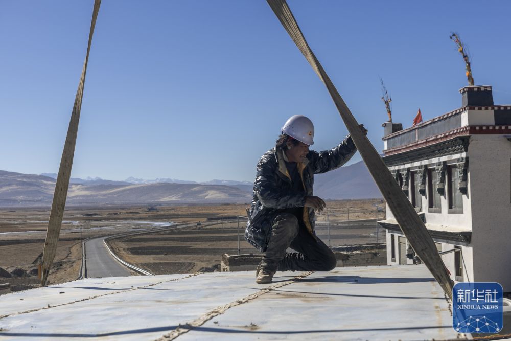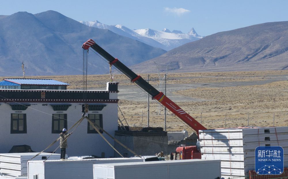 11日,在萨迦县麻布加乡白拉村,工程人员与有相应技术的村民一起建设活动板房。据了解,这是萨迦县地震灾区开建的第一批板房。