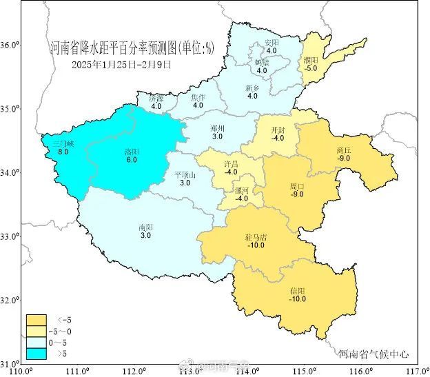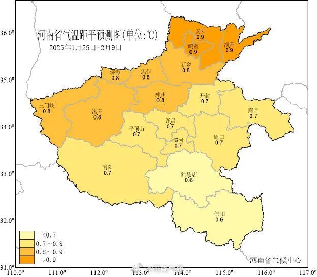 说明:本气候预测产品是河南省气候中心综合多个数值-统计模式结果来预测未来一段时间内的天气相对气候平均态的偏离情况。由于预测时间较长,气候预测产品具有一定的不确定性,公众需客观认识气候预测的不确定性,同时关注预测产品的滚动更新,科学合理运用气候趋势预测结果。