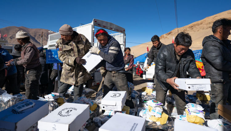 1月10日,在定结县郭加乡切村安置点,群众分配救灾物资。(新华社记者 丁增尼达 摄)
