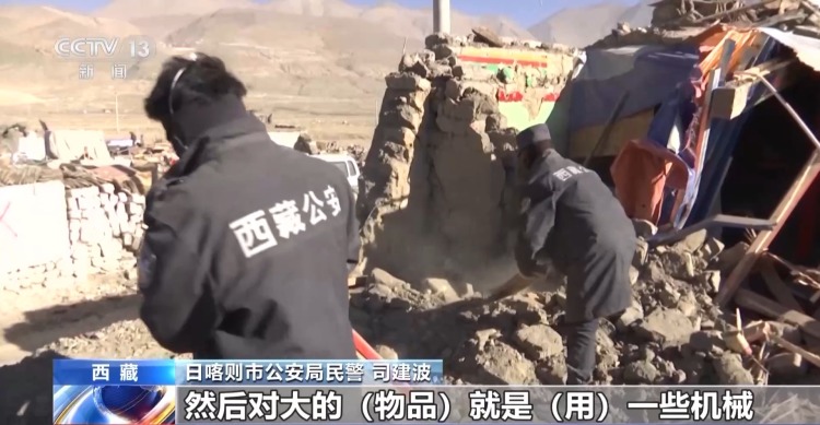 日喀则市公安局民警司建波:人力加机械结合起来进行挖掘。对于一些比较贵重的小物件物品,民警只能徒手去挖,在废墟里面去找。对大的物品就用一些机械把墙体挖开后,我们直接搬。