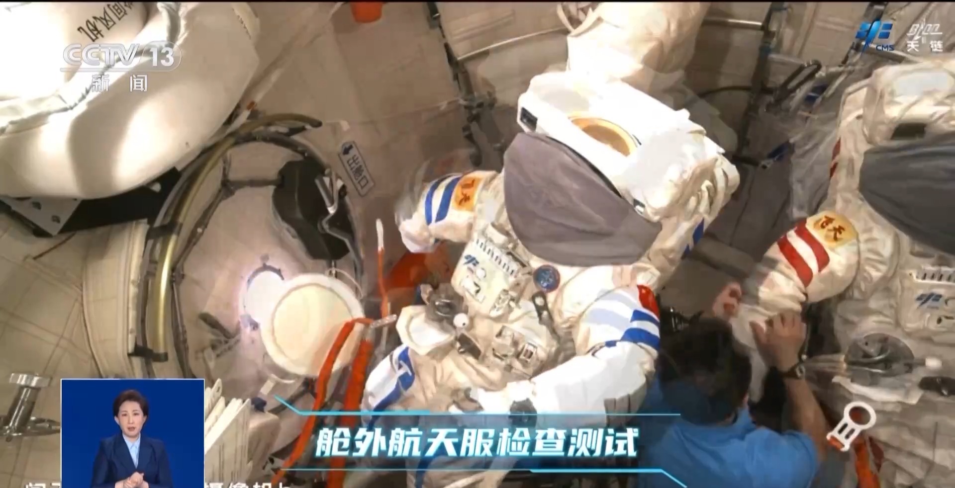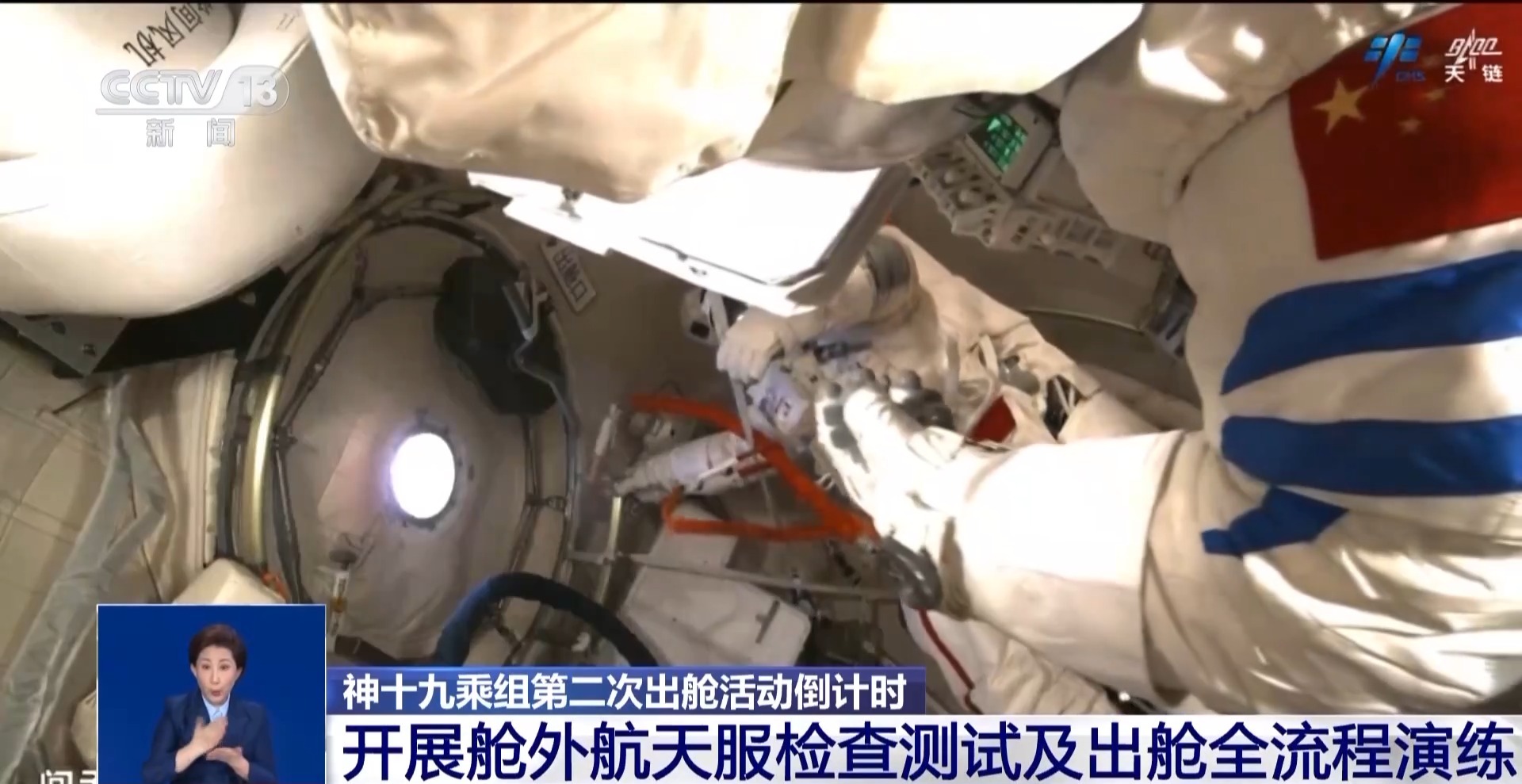 问天气闸舱的定向摄像机记录下了航天员开展舱外航天服检查测试以及出舱航天员穿着航天服在轨训练的工作画面,三名航天员还进行了出舱全流程演练以及方案预案的学习和推演。