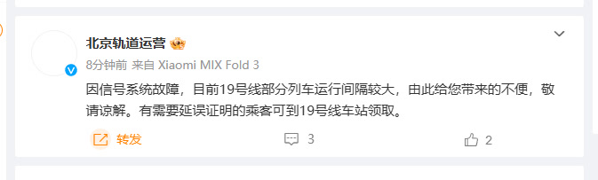 北京地铁19号线信号系统故障,部分列车运行间隔较大