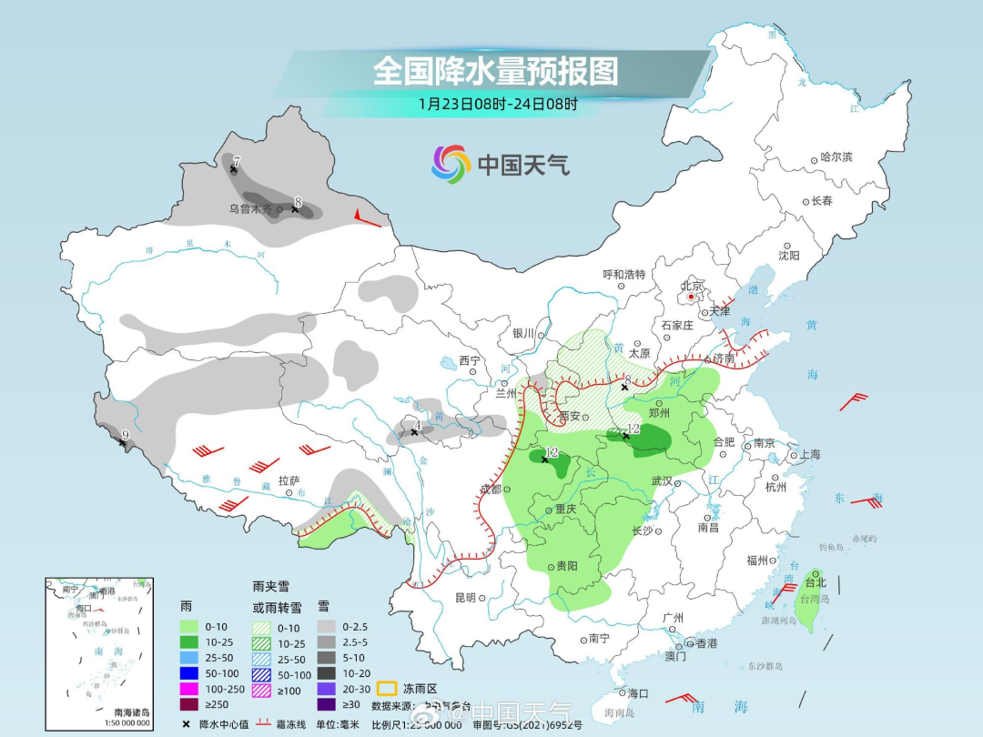 这也意味着本次雨雪天气过程,将有望为西安城区带来去年入冬以来的首场降雪。预计1月23日夜间平原地区有分散性小雨、南部山区有分散性雨夹雪(0~1毫米);1月24日城区及平原地区小雨转雨夹雪转小到中雪,南部山区有中到大雪,局地大到暴雪(3~12毫米);25日城区及平原地区阴天转小到中雪,南部山区中到大雪(3~5毫米)。