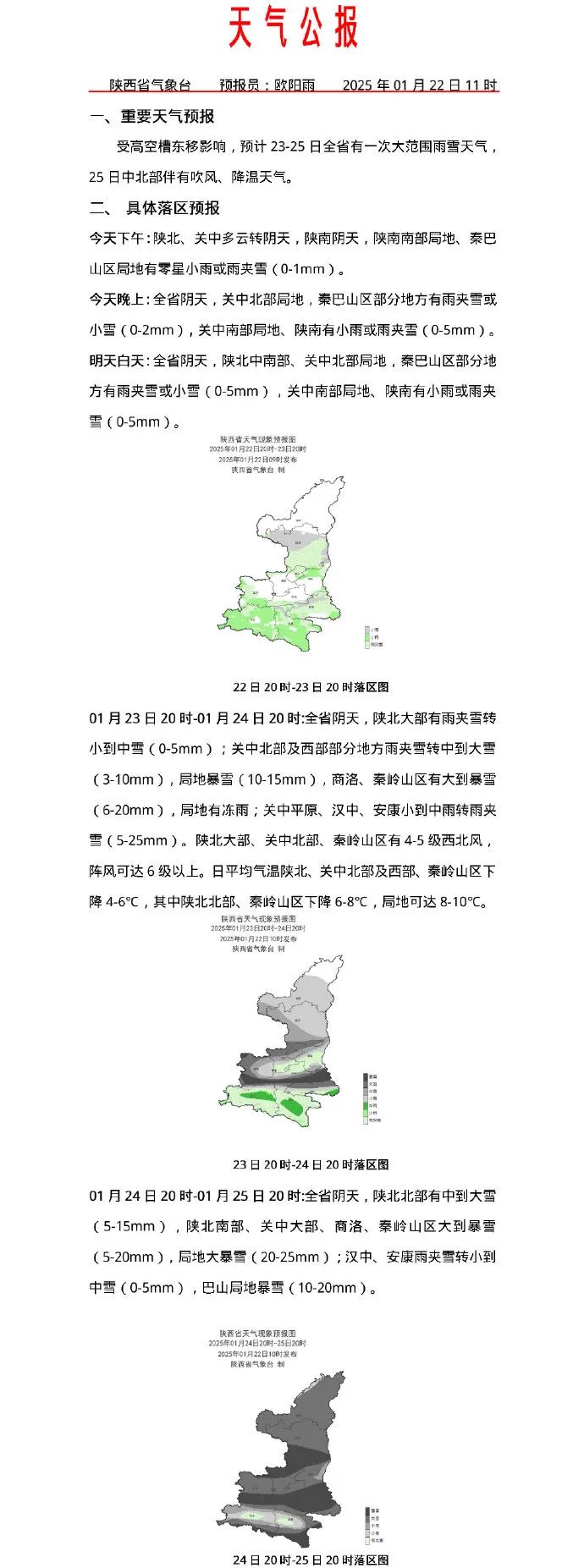 1月22日,据陕西气象消息,受高空槽东移影响,预计23-25日全省有一次大范围雨雪天气,25日中北部伴有吹风、降温天气。