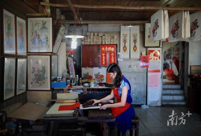 年关将至,冯氏木版年画老铺内外早早地洋溢着喜庆的年味。江湖人称“年画女侠”的佛山木版年画市级代表性传承人刘钟萍,正聚精会神地雕刻着手中的木版。铿锵有力的凿木声里,诉说着千百年来岁吉年祥的不变祈愿。