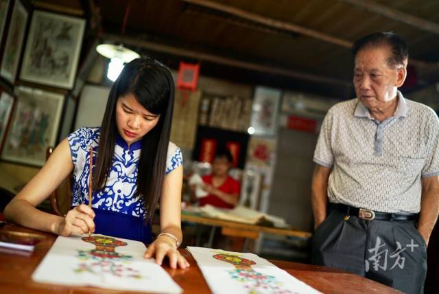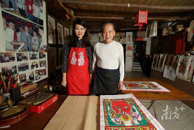 佛山木版年画代表性传承人刘钟萍与师父冯炳棠。