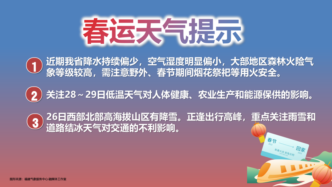 关注1月25日至26日和1月30日至2月1日降水和低能见度天气对交通的不利影响,重点关注26日我省西北部高海拔山区雨雪天气和道路结冰对春运的不利影响。